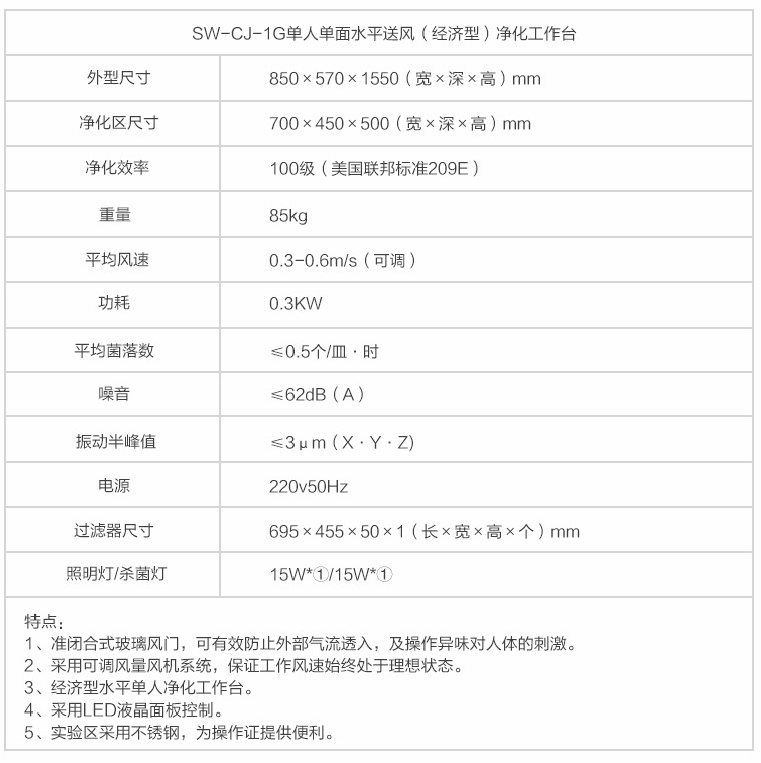 蘇州智凈單人單面水平流凈化工作臺(準閉合式門)SW-CJ-1B